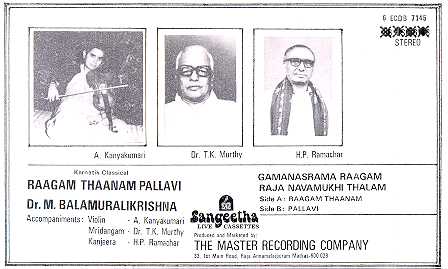The recording is from an out-of-print cassette on the Sangeetha label. It features several outstanding accompanists: A. Kanyakumari on violin, T.K. Murthy on mridangam and H.P. Ramachar on kanjira. The back cover is available here.The piece is a composition of Balamuralikrishna in the extended ragam-tanam-pallavi form, set in the ragam Gamanasrama and in the rarely-heard talam Raja Navamukhi.