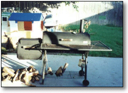 "(This) one is a NBBD (New Braunfels Black Diamond). I have done most of the mods mentioned in the faq. There is a baffle between the firbox and cooking chamber. I extended the smokestack inside to grill level. I made a larger fire grate so it would sit up higher in the fire box. I also made the front shelf."