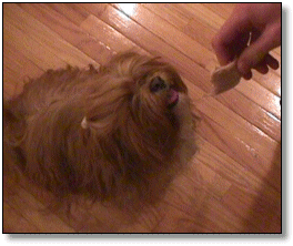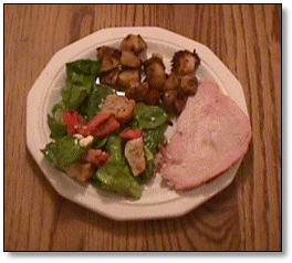 | January 4, 1998 Dave learned to keep the temperature down by adjusting how many coals were placed in the pit, and the first turkey came out great! ![]() Beauregardless, the relentless Barbecue Dog, eyes the 12-pound turkey. The bird was rubbed down with olive oil before cooking; tarragon and savory were sprinked in the cavity for flavor. ![]() After 2 hours in the pit. ![]() Done after 6 hours ... ![]() ... with a very nice smoke ring. ![]() Served up with skillet-baked potatoes, salad (spinach, bibb lettuce, feta & goat cheeses, mushrooms, tomatoes, croutons, honey-Dijon mustard dressing), and a Graves wine. ![]() Oh, yes, and a little treat for Beau, too!. |