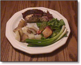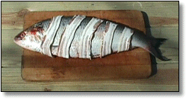 | February 14, 1998 Roe shad are available from the North Carolina shore each spring. ![]() A four-pound shad wrapped with bacon strips. ![]() The shad was cooked very slowly over pecan coals. ![]() All done with a beautiful golden color. ![]() Served up with boiled potatoes and a lettuce salad. |