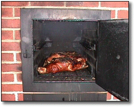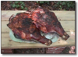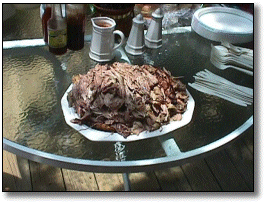 These shoulders weigh 15 pounds each. ![]() Wilber working at night. Coals are being made on the left for the pit on the right. ![]() Morning happiness! After about 8 hours in the pit. ![]() All done after a little over 11 hours. ![]() Pulled pork barbecue ready to serve just minutes out of the pit. Mr. Brown is on the right side of the platter; the Devine Miss White is on the left. This was the barbecue from just one shoulder! |