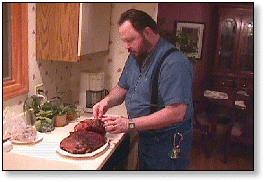 | March 20, 1999 ![]() Warming up Wilber in the early morning hours by making the first batch of coals. ![]() Two pork shoulders and a beef brisket (rubbed) ready to go. ![]() ![]() Wilber at work. (More coals are being made in the coal hearth on the left.) In the meantime ... ![]() Rocky and Cheryl cooking up a little basting sauce (honey, Jack Daniel's, and garlic powder) for the salmon. ![]() Rocky, with Beauregard's "help", basting the salmon on the OK Joe Traditional. ![]() Lunchtime! ![]() A Wilber's-eye-view, through that famous "thin blue smoke", of Dave checking out the progress of the shoulders and brisket in the afternoon. ![]() Time to turn. ![]() "Fork testing" the brisket. ![]() Rocky moves a few coals from the hearth to the pit. ![]() Wilber, the mascot, takes a Cheerwine break. ![]() Meanwhile, a few racks of Irish pork ribs are cooking in the OK Joe. (Rubbed, of course, with Dave's World Famous TOP SECRET (tm) "Slap Your Momma" Brand Rib Rub and Summer Poultice.) Later that evening ... ![]() ![]() Rocky pulls a perfectly done shoulder. ![]() ![]() The brisket, cooked over mostly hickory coals, had a really nice smoke ring. ![]() Cheryl's baked beans came in both hot and very hot varieties! ![]() Mary, shown sampling her barbecue slaw, is ready to eat. ![]() ![]() The perfect end to another great day in the Southland! |
