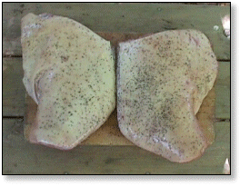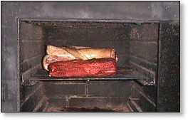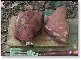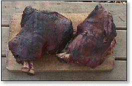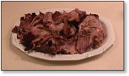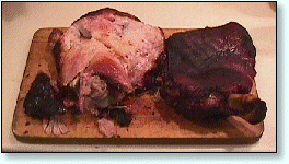| May 9, 1999 The picnic, with the Boston butt removed from the shoulder, is not an ideal cut for pulled pork barbecue. But, this pair, purchased at 58 cents a pound, were worth a try. ![]() A pair of 7-pound shoulder picinics sprinkled with salt and black pepper. ![]() Underway in Wilber. (That's a little beef brisket up front!) ![]() Time to turn. ![]() Beauregardless, the Barbecue Dog, keeps a watchful eye out. ![]() "All done and ready to ... ![]() pop the top and .... ![]() pull the pork. |