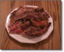 | Finishing Sauces & Such Before serving the shoulders, the skin is shucked from them to expose the meat. Any residual fat is raked off the surface. (If perfectly done, little will remain.) At a traditional Pig Pickin', the barbecue is likely going to be pulled from the bone and served in chunks. This "pulled pork" barbecue is mighty hard to beat. The barbecue served in a joint is usually chopped. The addition of finishing sauce during or immediatley after chopping is common. If you decide to go the chopped route, be sure to remember that chopped and pureed ain't the same! Properly cooked barbecue is very tender and slicing is a tricky business when it is warm. Allow the barbecue to cool somewhat for consistent success. Of course, slicing failures are every bit as good as the successes. ![]() A perfectly cooked shoulder. ![]() Shoulder with the skin removed. Notice the lack of residual fat. ![]() The barbecue after being pulled from the shoulder. Some folks prefer their North Carolina pulled pork barbecue without the addition of a finishing sauce. By no means is it necessary. If you do use one, avoid drowning out that wonderful smoke flavor you just took all day to create. Some joints sell bottles of their sauce for use at home. If you are making barbecue, you probably want to make your own sauce as well. Take your pick from these recipes covering both "eastern" and "western" styles of North Carolina vinegar-based barbecue sauces. If you cannot decide which style to use, give then both a try! |