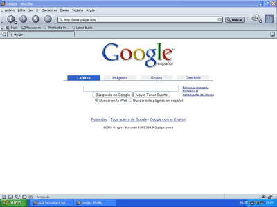 2. En la parte superior aparecen unas pestañas donde especificaremos si deseamos realizar la búsqueda en páginas web (activada por defecto), si deseamos buscar imágenes, en los grupos de noticias (los veremos posteriormente) o en el Directorio (que es una organización estructurada por temas de páginas web que mantiene Google).