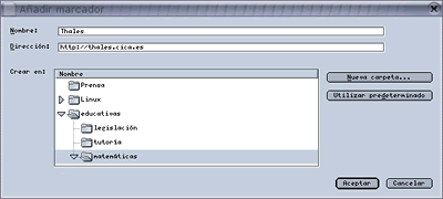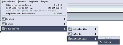 Este ha sido un primer acercamiento al uso de los marcadores, pero no es el más adecuado, pues no nos permite decidir en qué carpeta almacenar el marcador ni darle un nombre que nos permita recordar el contenido de la página. Vamos, por ejemplo, a almacenar la página de la asociación matemática Thales en una carpeta (ya veremos cómo se crean) llamada matemáticas. Para poder hacerlo debemos proceder de la siguiente manera: