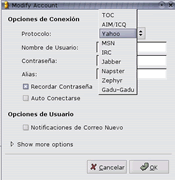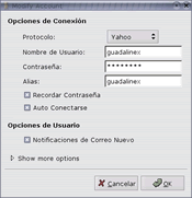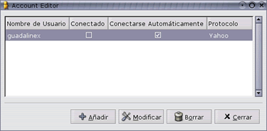 | 3. Lo primero que hay que hacer es seleccionar el Protocolo, el tipo de cuenta a crear: Yahoo, MSN, etc. Y luego completaremos los datos de la cuenta: el nombre de usuario, la contraseña, un alias (apodo), si queremos que Gaim recuerde la contraseña, si queremos que al lanzar Gaim nos conecte directamente y si deseamos que nos avise cuando recibamos correo nuevo (en Yahoo). | 4. Después de añadir la nueva cuenta (podemos añadir más si lo deseamos). Ya podemos conectarnos sólo con marcar la casilla de verificación Conectado.