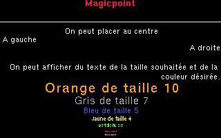 Cet article va décrire les fonctionnalités du logiciel MagicPoint. Ce dernier est l'un des rares logiciels libres permettant de realisér une présentation sous X-window. La présentation est décrite via un texte ayant une syntaxe simple mais offrant toutes les possibilités souhaitées.