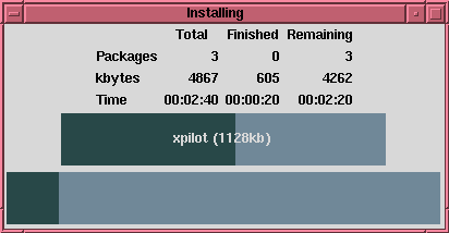 After you've begun the installation, a window appears like the one in figure 79. It tracks the progress of the installation so you'll know something is happening. The top bar shows how much of the current package (whose name is listed inside of it) has been installed while the bottom graph shows how much of the total installation has been finished. The number of packages, package sizes, and time estimates are continually updated.