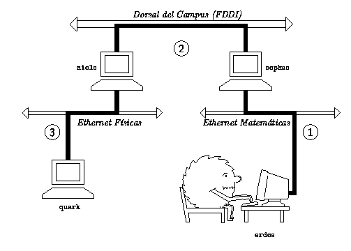 Esta conexión se gestiona con un nodo dedicado, denominado pasarela, o gateway, que maneja los paquetes entrantes y salientes copiándolos entre las dos Ethernets y el cable de fibra óptica. Por ejemplo, si se encuentra en el Departamento de Matemáticas, y quiere acceder a quark situada en la LAN del Departamento de Físicas desde su máquina Linux, el software de red no puede mandar paquetes a quark directamente, porque no esta en la misma Ethernet. Por tanto, tiene que confiar en la pasarela para que actúe como retransmisor. La pasarela (llamémosla sophus) reenvía entonces estos paquetes a su pasarela homologa niels del Departamento de Físicas, usando la troncal, y por fin niels los entrega a la máquina destino. El flujo de datos entre erdos y quark se muestra en la figura 1.1 (con disculpas a Guy L. Steele).