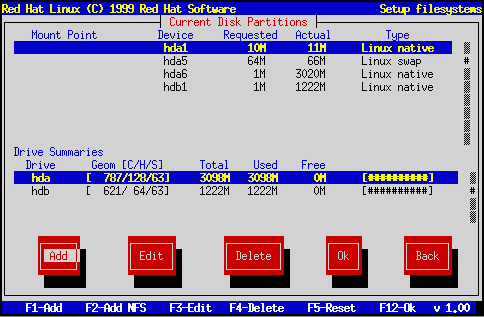 Si ha seleccionado Disk Druid, se le presentará una pantalla que se parece a la figura fig:inst-dd-main-net. Aunque pueda parecer confusa al principio, realmente no lo es. Vayamos sobre cada una de las tres secciones de Disk Druid.
