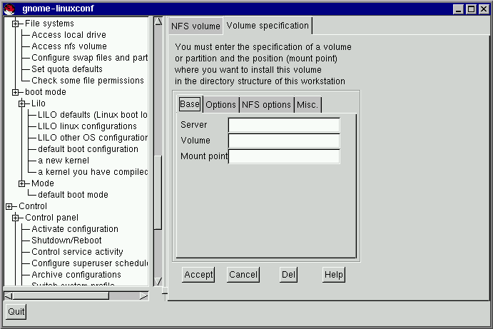 Esto es todo lo que necesitas para crear el volumen. Linuxconf actualizará tu /etc/fstab de acuerdo con los cambios. En caso de que tuvieras otras necesidades, haz el favor de leer la pantalla de ayuda en la pantalla Especificación de volumen y la página de manual de mount para obtener más información