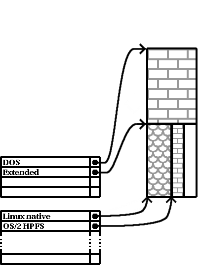 Tal como implica esta figura, existe una diferencia entre particiones primarias y lógicas - puede haber únicamente cuatro particiones primarias, pero no existe un límite fijado al número de particiones lógicas que pueden existir. (No obstante, en realidad probablemente no es buena idea tratar de definir y usar más de 12 particiones lógicas en un único disco duro.)