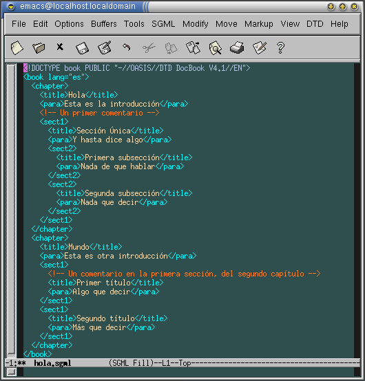 Como nuestro primer ejemplo estará escrito en castellano, es necesario indicar el idioma a que vamos a usar, para ello necesitamos editar uno de los atributos de la marquilla <book>; através de menúes esto se puede hacer con Markup->Insert Attribute (Botón Derecho). A continuación se presentarán los diferentes atributos de dicha marquilla, es necesario entonces seleccionar LANG->Set Attribute, a continuación en el buffer aparecerá Value for LANG(CDATA): , por lo que habrá que escribir es. Tendremos entonces que nuestro editor lucirá de la siguiente forma