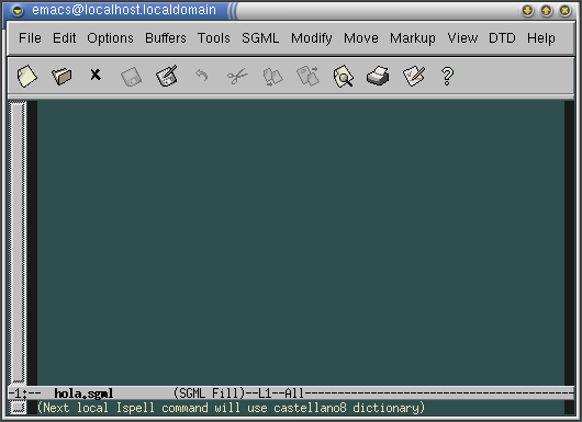 Para comenzar a escribir un documento necesitará abrir una sesión de emacs, para ello desde la línea de comandos del shell, ejecute emacs hola.sgml&, en mi computador esto luce de la siguiente forma: