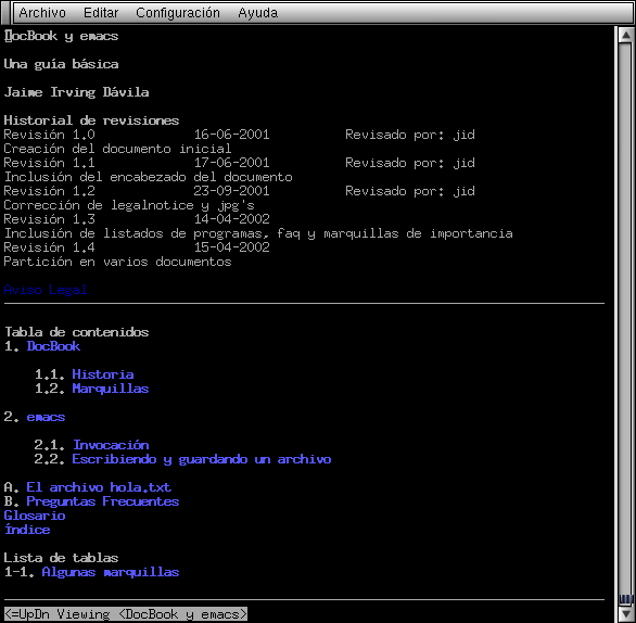 Después de esta secuencia de teclas es necesario que escriba DocBook 4.1 y luego ENTER. Cuando nos encontremos en situaciones como éstas, en las que una misma acción se puede realizar mediante una escogencia en el menú y un atajo en el teclado lo escribiremos usando una abreviación como la siguiente DTD->Insert DTD (C-c-C-u-C-d)