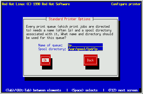 After selecting a printer type, you'll be presented with a dialog box entitled ``Standard Printer Options'' (see Figure 39). Enter the name of the queue and the spool directory you'd like to use, or accept the default information.