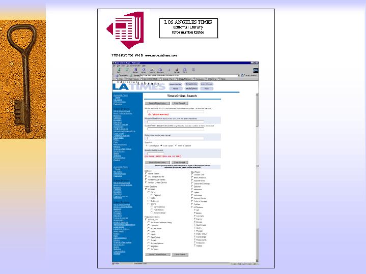 [This picture shows the Los Angeles Times Editorial Library guide for searching the LA Times text archive.] View a larger jpg