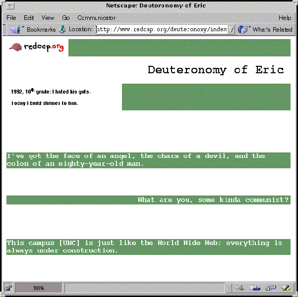 Frames have a really bad rep on the internet. On one hand, they're great for organizing content and keeping repetitive information from having to be repeatedly passed back and forth from the server. But at the same time, they can be highly annoying, with users trying to follow links from inside a frame and then getting "trapped" inside it. The latter tends to overshadow the former, and it's often considered faux paux. Well, to hell with that bullshit! Frames are awesome if done correctly!! To many, frames are certainly evil: even when it's just one frame on the left to hold the menu and the content on the right is clichéd and can be done just as well without frames. Here's a good example of when you shouldn't use frames: Novell's Netware 5 Documentation makes unnecessary use of four frames, which could have easily been broken down into two frames, and even then, there are ways to do it without frames altogether! Sunfreeware.Com is an example of a site that uses frames well, but you wonder if they could've done it better without them. The Deuteronomy of Eric is a good example of how to effectively use frames. In fact, you sometimes can't even tell that it is using frames. The beauty of this site is that it is certainly simple, with content that updates itself! Emulate this page. |