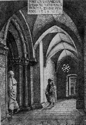 In the muted light of an open doorway and a rosette window two Jewish men are shown walking through the entry porch of the Regensburg synagogue. Altdorfer made two etchings of the temple just before it was destroyed on February 22, 1519: this view and one of the interior nave. Emperor Maximilian had long been a protector of the Jews in the imperial cities, extracting from them substantial taxes in exchange. Within weeks of his death, however, the city of Regensburg, which blamed its economic troubles on its prosperous Jewish community, expelled the Jews. Altdorfer, a member of the Outer Council, was one of those chosen to inform the Jews that they had two hours to empty out the synagogue and five days to leave the city. The date of the demolition inscribed at the top of the print suggests that Altdorfer made the preparatory sketches, as well as the etchings themselves, with the knowledge that the building was to be destroyed. The prints appear to have been quickly produced, quite possibly during the five days prior to the temple's destruction: The plate was not evenly etched, particularly in the areas of dense hatching, where the individual lines lose clarity. In addition, the slightly tipsy vaults appear to have been traced freehand rather than with a compass. Despite the seemingly sensitive portrayal, the print was not intended as a sympathetic rendering of an aspect of Jewish culture, but rather as a much more dispassionate recording of the site. It is thus the first portrait of an actual architectural monument in European printmaking.