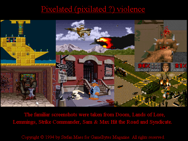 With recent titles like Doom and especially Mortal Kombat, the vast amount of violence in (computer) games, is back a hot topic. If one should believe everything the moral knights claim to be true, we're only a fraction away from the situation where blood actually streams out of your monitor. I'm in no way claiming they're totally wrong, but please don't over react !