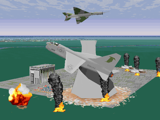 Bitmapped animations are used to create a variety of special effects, including animated catapult officers directing aircraft on the carrier deck; multiple explosion effects digitized from actual video; and ejection/parachute sequences. The game environment itself features texture- mapped water, sky, coastlines, roads, bridges, trees, and cities, while atmospheric hazing, time of day, and weather effects bring the world to life.