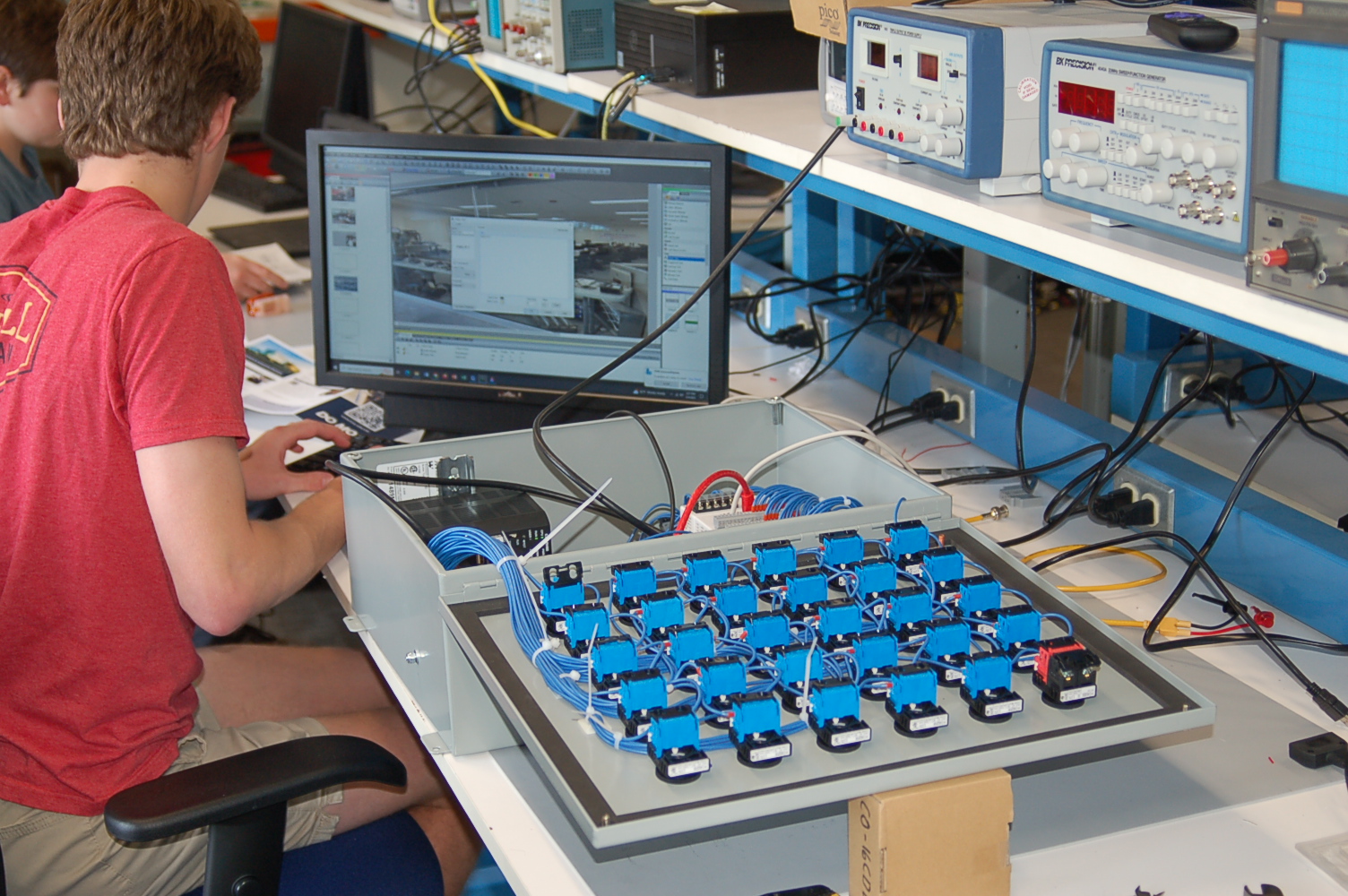 - Tech school guest kiosk, a panel with lots of pushbuttons where each one cues up a photograph of a different technical/industrial program at the college. This project uses a CLICK PLC and a C-More remote HMI connected to a large-screen HDMI television monitor -- Photo