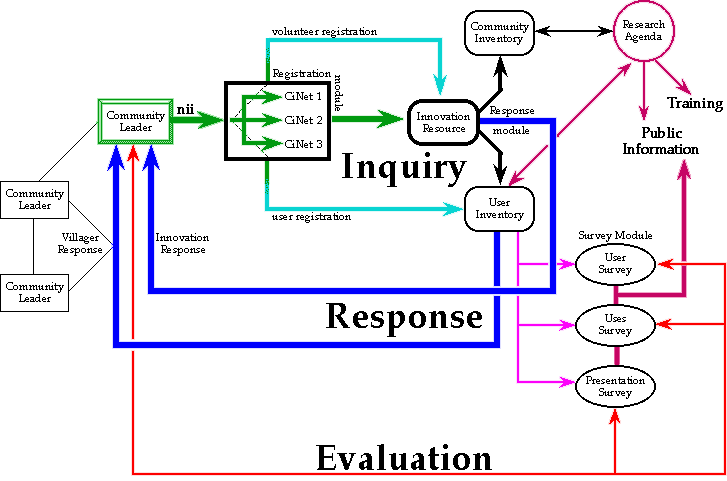 At the same time that it is responding to the users' inquiries, CiNet updates these users' inquiry logs keeping track of their requests. These logs are used in the villager response element placing every request in a context of other leaders making similar inquiries or receiving similar responses. And finally, the CiNet response module links the community leader to other users (through CiNet's "community inventory") who have either asked similar questions, identified similar innovations, or come from the same geographic community. Thus, every inquiry generates parrallel responses: one from the innovations resourse responding to the question and one from the user inventory placing the inquiry into a community context.
