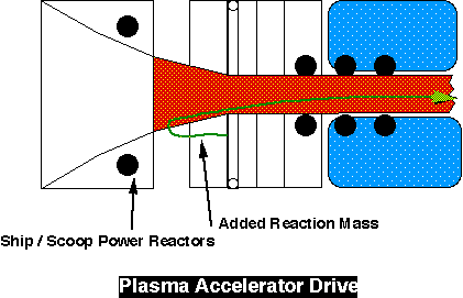 The system is basically an electromagnetic accelerator running through the core of the ship, powered by onboard fusion reactors. The accelerator could accelerate scooped-up interstellar matter (or ram flow), or reaction mass carried in the ship. Again, this kind of system is different from a true Bussard ramscoop drive in that the ram flow is not fused for power. Indeed, it normally isn't even slowed down. The engine functions in various ways at various speeds.