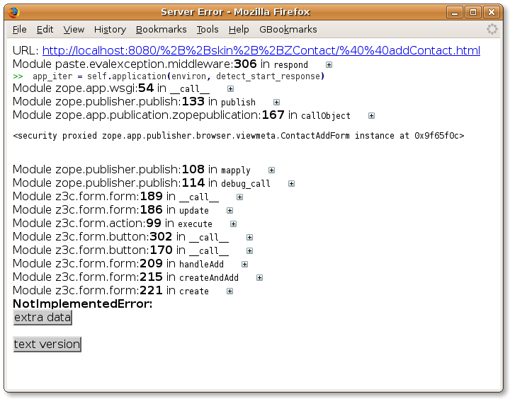 If you actually tried to use the add form, and cliked the add button, you should have gotten a NotImplemented error. If you chose to run the debug.ini configuration instead of deploy.ini with paster, then you probably got a nice screen like this: