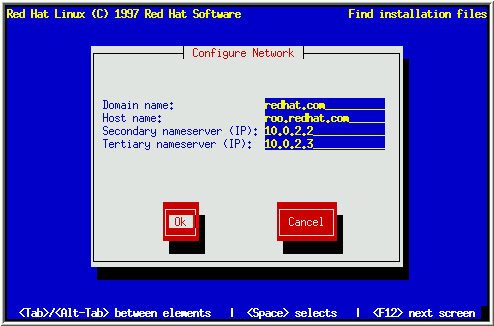 After the first dialog box, you may see a second one. It will prompt you for a domain name, a hostname, and other networking information (see Figure 12). Enter the Domain name for your system and press [Enter]; the installation program carries the domain name down to the Host name field. Enter the hostname you are using in front of the domain name to form a fully qualified domain name (FQDN). If your network has more than one nameserver, you may enter IP addresses for additional nameservers in the Secondary nameserver and Tertiary nameserver fields. Choose OK to continue.