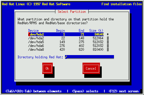 At this point, a dialog box entitled ``Select Partition'' is displayed (see Figure 14). Enter the device name of the partition holding the RedHat directory tree. There is also a field labelled ``Directory''. If the RedHat directory is not in the root directory of that partition (for example, /test/new/RedHat), enter the path to the RedHat directory (in our example, /test/new.