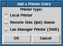 In order to create a new print queue, choose Add. Then, select what type of printer is being added. There are 3 types of print queues which can be configured with printtool: