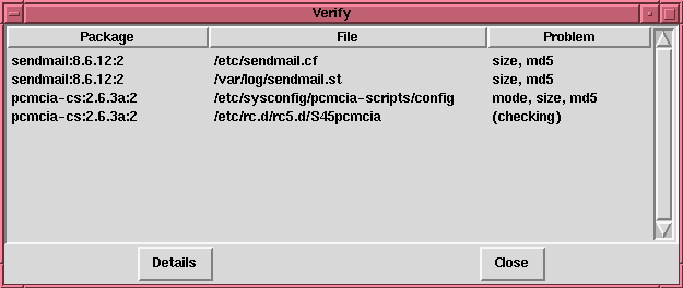 Choosing the packages to verify is the same as choosing the packages to query. Select the packages and use the Verify button or choose the Verify entry from a context sensitive menu. A window opens like the one in figure 75.