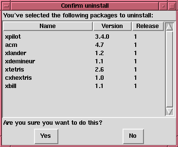 Once you've begun the uninstall, glint asks for confirmation, showing a window like the one in figure 80. All of the packages that are about to be uninstalled are listed. You should look at them all to ensure you're not about to remove something you want to keep. Clicking the Yes button will start the uninstallation process. After it completes, the packages and groups that have been removed will disappear from any windows they were in.