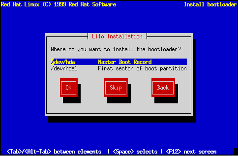 es el lugar recomendado para instalar LILO, a menos que ya exista otro cargador de sistema operativo albergado en el MBR, como el System Commander u OS/2's Boot Manager. El registro maestro de arranque es un área especial de su disco duro que la BIOS de su ordenador carga automáticamente, y es el punto más inmediato por el que LILO puede tomar el control del proceso de arranque. Si instala LILO en el MBR, cuando su máquina arranque, LILO le mostrará el indicador boot:; entonces puede arrancar Red Hat Linux u otro sistema operativo configurado en LILO para arrancar (véase mas abajo).