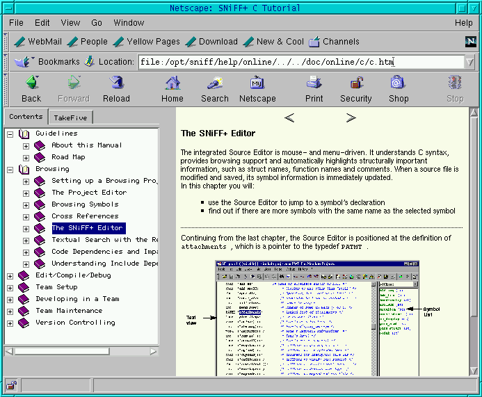 SNiFF+ de takefive software es un entorno integrado de desarrollo disponible para Linux. Takefive ofrece una versión descargable gratuita en http://www.takefive.com/penguin. El software revisado aquí viene de un CD de demostración, y parece idéntico a la versión descargable. La restriccioón en ambas versiones es que tienen un límite de 200 ficheros. Esta revisión corresponde a la versión 3.2 de SNiFF+, y ha sido probada bajo Redhat Linux 6.0.