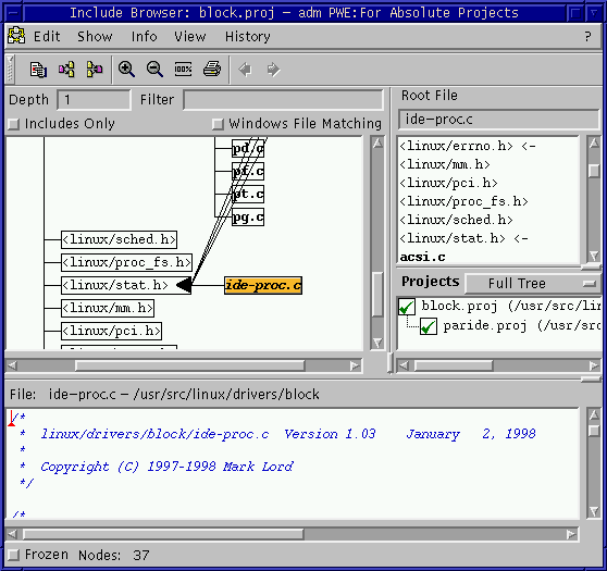 Para ver qué ficheros incluye un fichero .c, o cuando un fichero .h es usado.