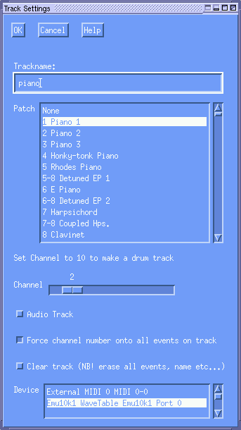 En donde lees "trackname" debes darle un nombre a tu pista, el nombre debe darte alguna clave con respecto al instrumento de que se trate como también quizá alguna información sobre la parte en la que interviene en tu pieza, como por ejemplo, mano derecha e izquierda de tu piano, melodía...