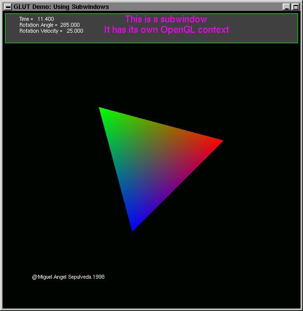 This concludes a very simple introduction to the use of GLUT subwindows. At this point I have to mention that although it is good to experiment with them and test them under various platforms unfortunately GLUT subwidows are not fully operational in all environments. Users with 3Dfx based cards will find that subwindows are not functional yet due to hardware limitations. Also I have found a big performance penalty when using subwindows under certain platforms. For instance, under my Linux Alpha with a 2Mb Matrox Millenium a subwindow makes the application run about twice as slow, probably because unfortunately the X server for Alphas still doesn't support any hardware acceleration. On the other hand, the same application under windows 95 with a 2Mb ATI RageII with SGI's OpenGL driver runs wonderfully.