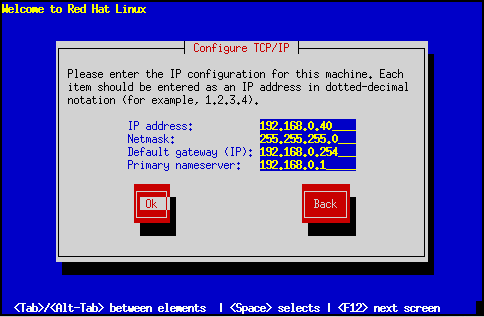 En el primer diálogo se pide la dirección IP y otras direcciones de red (véase la figura fig:inst-tcpip1). Introduzca la dirección IP que está usando durante la instalación y pulse Enter. El programa de instalación intenta adivinar su máscara de red basándose en su dirección IP; puede cambiar la máscara de red si no es correcta. Pulse Enter. El programa de instalación supone las direcciones de la pasarela por defecto y el servidor de nombres primario a partir de su dirección IP y máscara de red; puede cambiarlos si no son correctos.