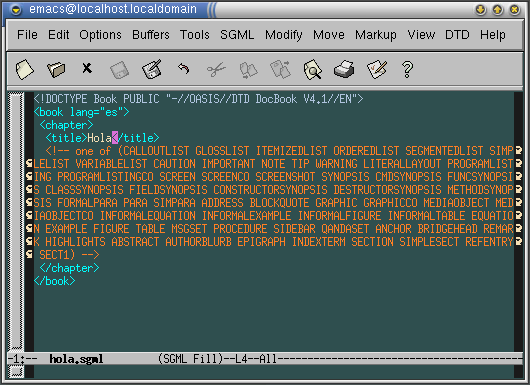 Para comenzar a escribir un documento necesitará abrir una sesión de emacs, para ello desde la línea de comandos del shell, ejecute emacs hola.sgml&, en mi computador esto luce de la siguiente forma: