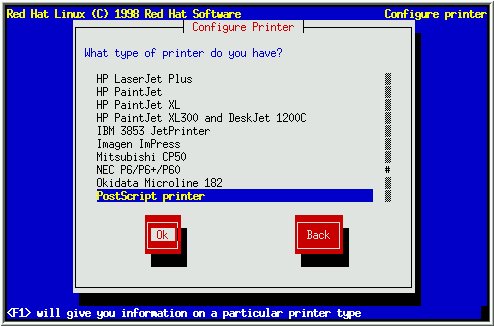 Next, you'll see a dialog box entitled ``Configure Printer'' (see Figure 43). Select the printer type that most closely matches your printer. Select Next, and press [Space] to continue.