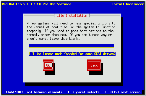 Next, the installation program will ask if you wish to add default options to the LILO boot command (see Figure 49). Any options you enter will be passed to the Linux kernel every time it boots. When you reviewed your computer's BIOS settings in Section 2.3.1, if you found your computer accesses a hard drive in LBA mode, check Use linear mode. Select OK and press [Space] when finished.