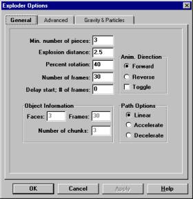 5.) Set the minimum number of pieces to the amount of pieces that you want your world to explode into. Set all of the other of options as you wish. Play around with them to get the effect that you wish. Also, delay the start of the explosion by 100 frames.