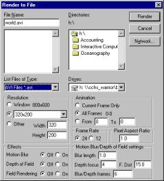 2.) Now set the parameters of the avi that you want to create. Be sure that the file extension is .avi in both the file type and the file name parameters. 300 x 200 is usually a sufficient size for the avi. Be sure that all frames are selected under the animation parameter. Be sure to save it in a location where it can later be found, also. It should look like this when the parameters are set:
