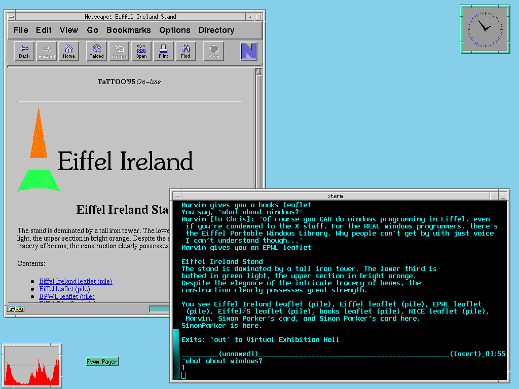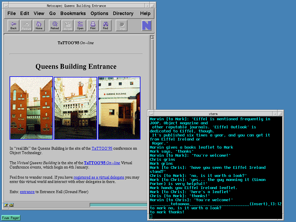 In early January 1995, we teamed up with IBM to stage the world's first Online Virtual Trade Exhibition. The event, known as TaTTOO'95 Online, was run in conjunction with TaTTOO'95, the annual real-life (RL) conference on Object Technology Transfer held at De Montfort University's, campus in Leicester, England. IBM, provider of the host computer and network connection at their site in Portsmouth, England, supported TaTTOO'95 Online.