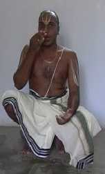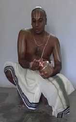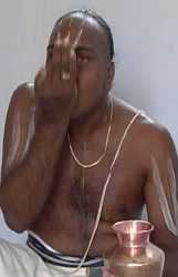 - Place "tiirtham" in the hollow of right palm and recite as follows