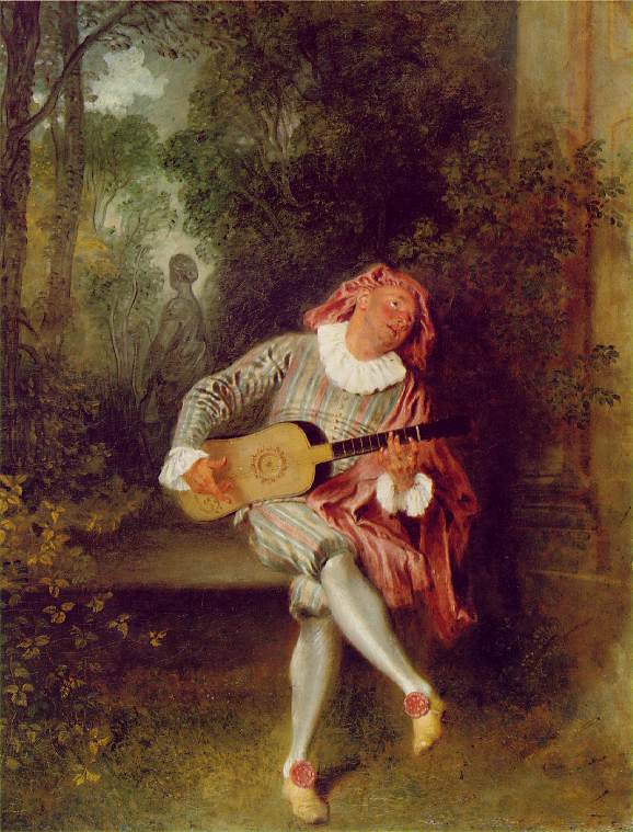 Watteau shows Mezzetin in a stage set, with an obvious backdrop behind him. The woman in the picture typically has her back to him - but she is only a statue, and as a painted statue (this is only a backdrop, remember), she is all the more remote from reality. Watteau plays off that exquisite remoteness against the actuality of Mezzetin. When we get past the beauty of those clothes, and the silly rosettes and the funny hat, we encounter a strong male animal - and a creature in pain. Look at the nervous passion of his fingers as they play the guitar; the vigorous shoulders turned away in longing; the bull neck flushed; and the five o'clock shadow on the big red face. It takes time to look past the vivid physicalities of the scene and register the personal sorrow. Watteau seems to be questioning whether the situation is, after all, so hilarious. He asks us also, I think, to consider the differences between the way we are seen, the way we present ourselves, and the way we really are. These are questions that have no answers, but Watteau poses them with a startling poignancy.