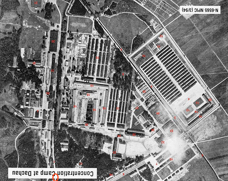 ![]() Click for larger format ORANGE CIRCLE LOWER LEFT: Approximate location of unlocked and unguarded gate on rail line where research indicates units of the 20th AD entered Dachau |